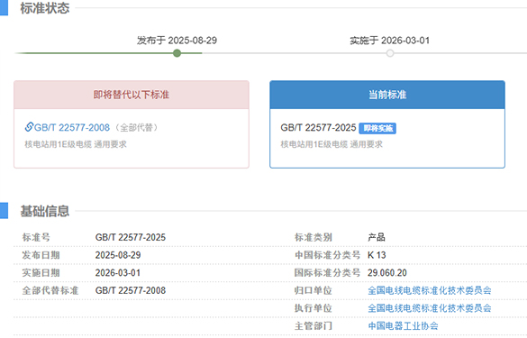 近日,国标委发布公告,由江苏上上电缆集团有限公司、中国核电工程有限公司、生态环境部核与辐射安全中心、深圳中广核工程设计有限公司、上海电缆研究所有限公司、上海核工程研究设计院股份有限公司、清华大学等核电监管机构、核电缆生产企业、核电设计院、核电运行单位共同制定的GB/T 22577—2025《核电站用1E级电缆 通用要求》国家标准于2025年8月29日正式发布,将于2026年3月1日实施。